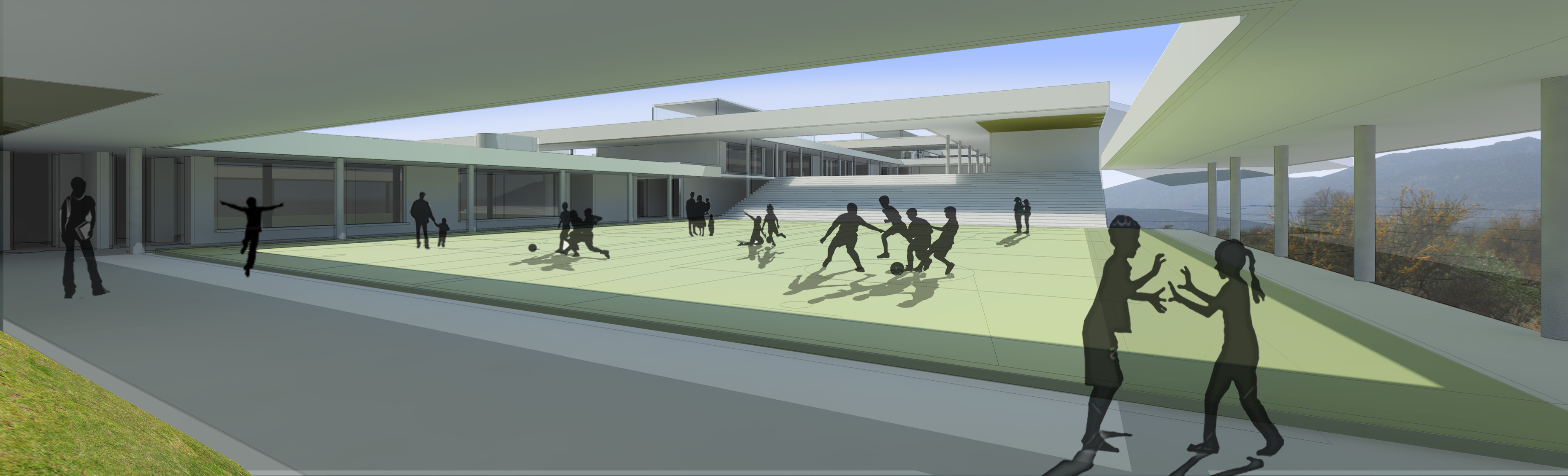 6.- Patios Lúdicos: aparecen por sustracción (depresión de la terraza). Se destinan para resolver las actividades complementarias en cada ciclo (cultivo, juego, deporte).