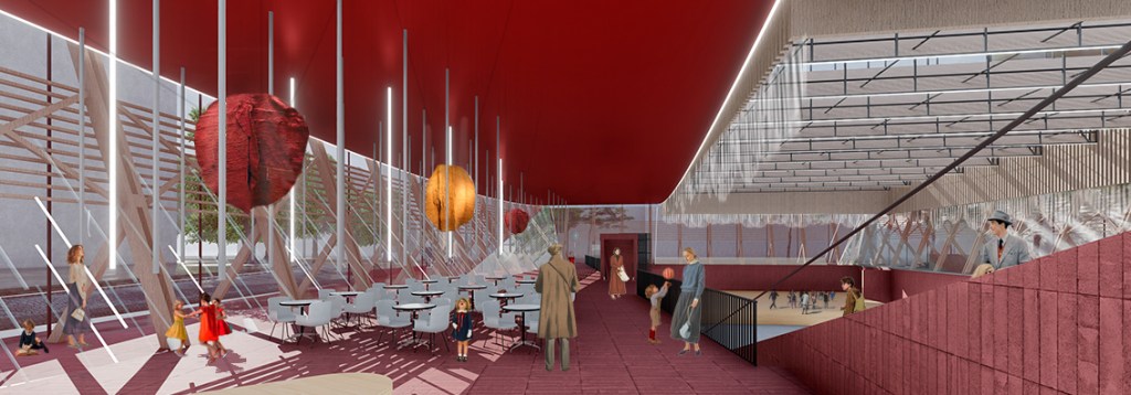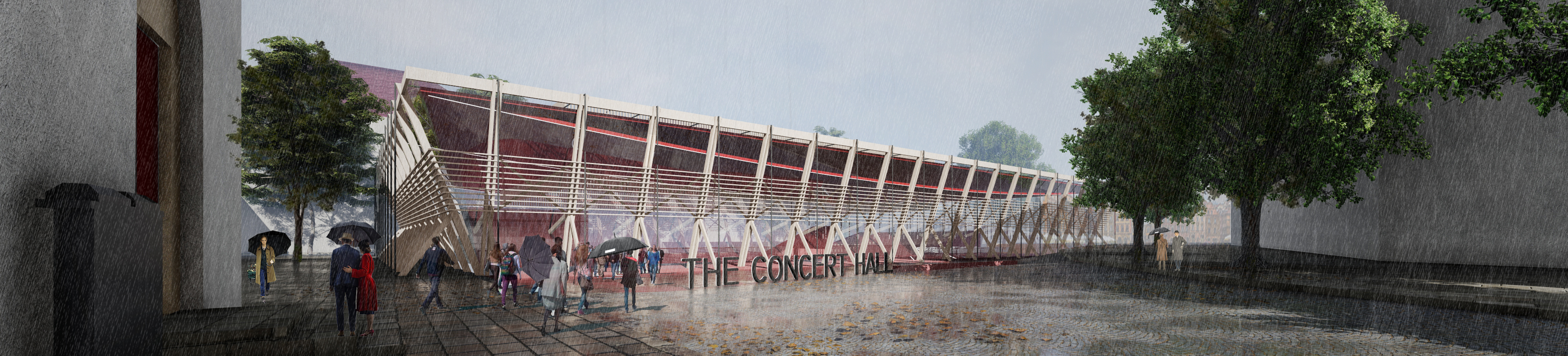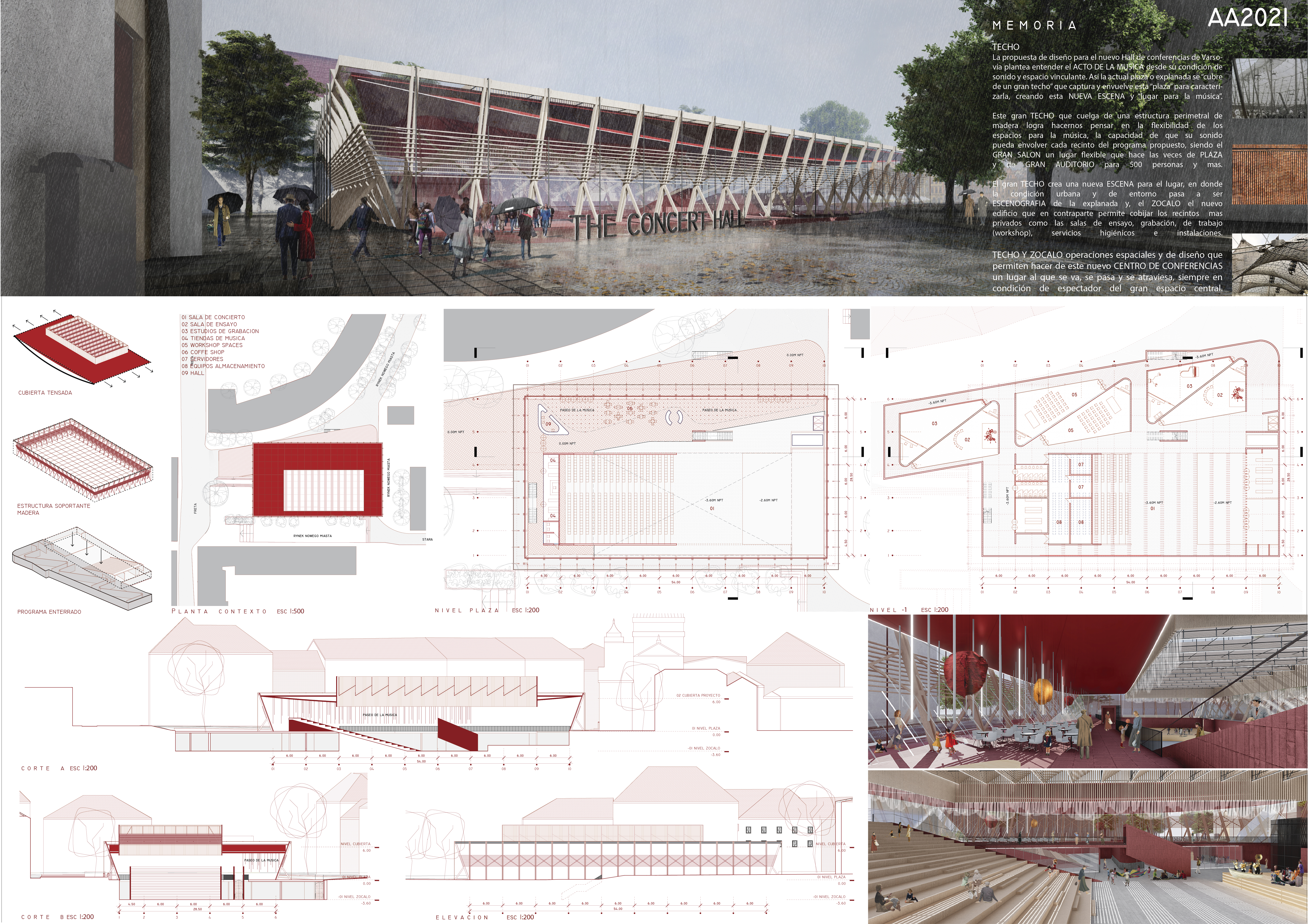 La propuesta de diseño para el nuevo Hall de conferencias de Varsovia plantea entender el ACTO DE LA MUSICA desde su condición de sonido y espacio vinculante. Así la actual plaza o explanada se “cubre de un gran techo” que captura y envuelve esta “plaza” para caracterizarla, creando esta NUEVA ESCENA y “lugar para la música”.