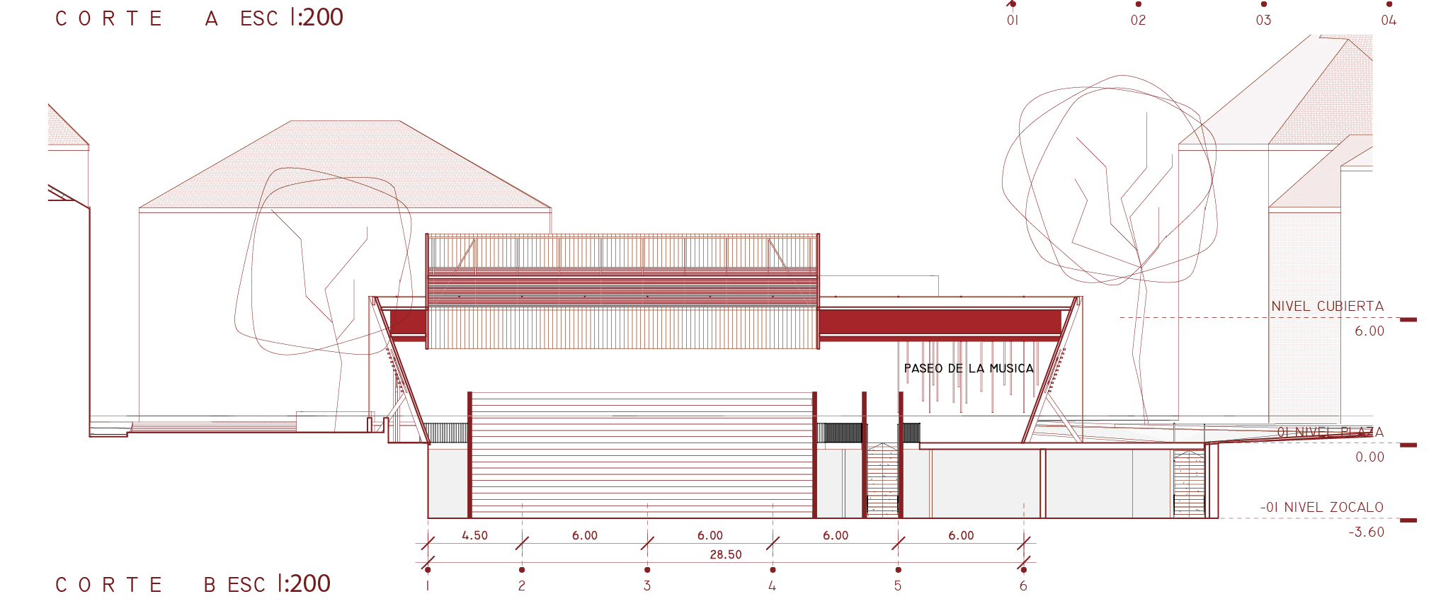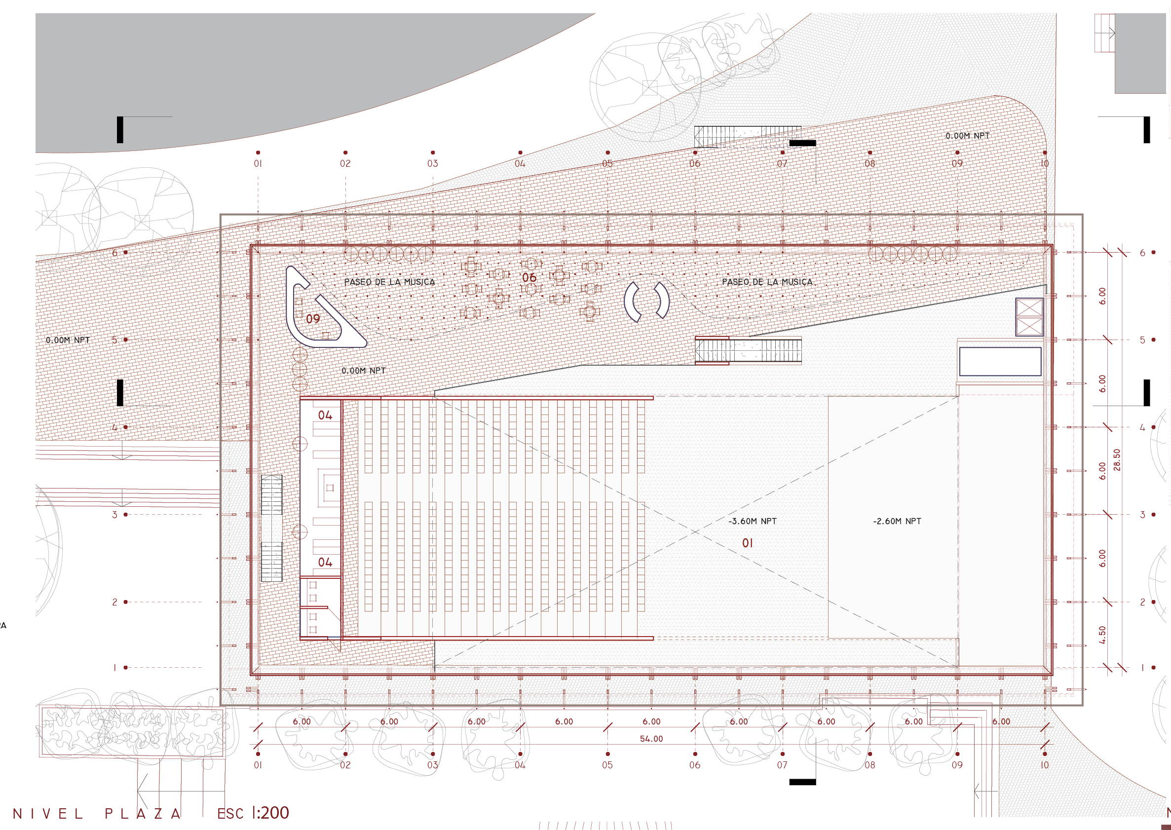Esta total transparencia se potencia instalando el programa de recintos en un nivel -1 (zócalo), en torno a un volumen rectangular de hormigón armado ENTERRADO que reconstruye el “PASEO” desde el boulevard hasta la IGLESIA, siendo soporte y contenedor a la vez de un pasar y permanecer, ocultando bajo suelo todo el programa mas privado, permitiendo así que este nuevo HALL DE LA MUSICA, desaparezca en escena día y aparezca en escena noche como una gran CAJA DE LUZ Y MUSICA.