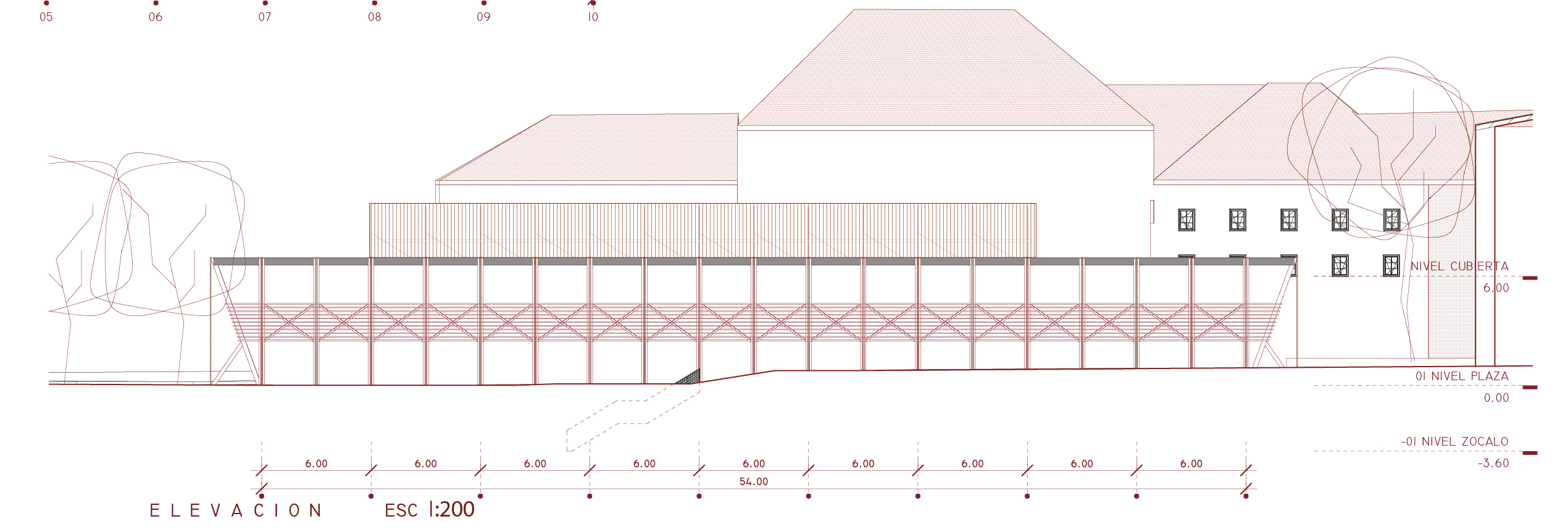 EL TECHO sobre la plaza busca instalarse mediante un perímetro permeable que confiere al espacio interior un ADENTRO Y AFUERA en plena integración. Esta transparencia se logra mediante el IZADO de estructuras repetitivas y prefabricadas de madera auto soportantes, que vinculadas a un sistema de cables de acero dan CUERPO Y SOPORTE a la cubierta que cuelga sobre la nueva plaza.