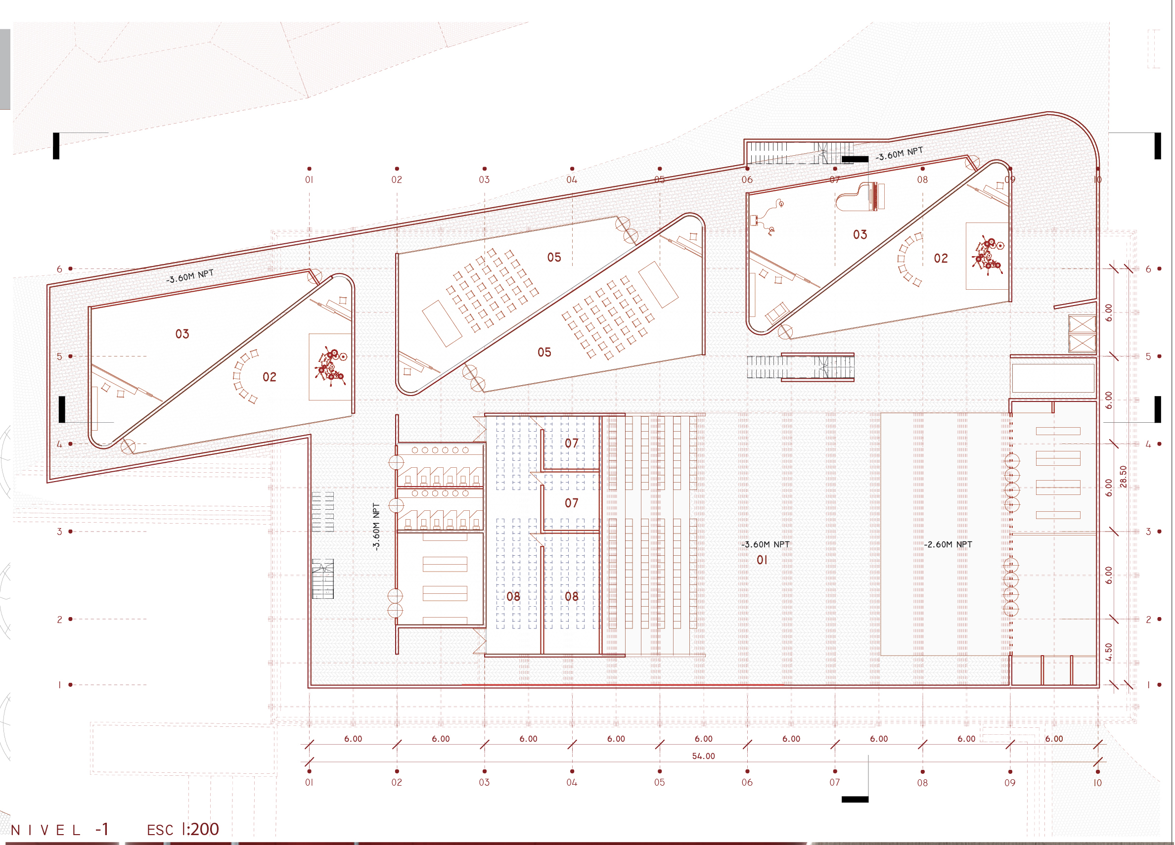 TECHO Y ZOCALO operaciones espaciales y de diseño que permiten hacer de este nuevo CENTRO DE CONFERENCIAS un lugar al que se va, se pasa y se atraviesa, siempre en condición de espectador del gran espacio central.